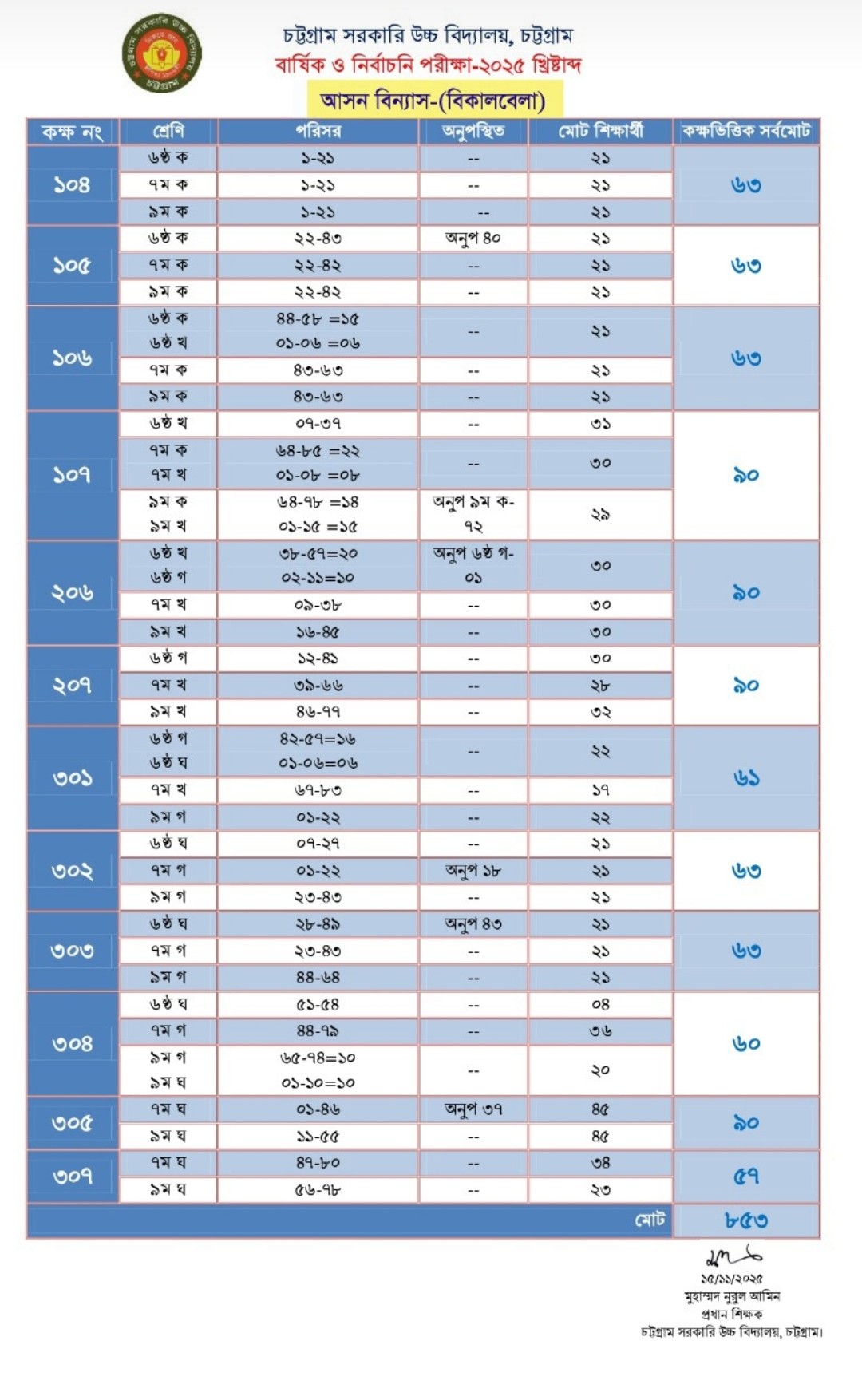 বার্ষিক ও নির্বাচনি পরীক্ষার আসন বিন্যাস (বিকাল বেলা)