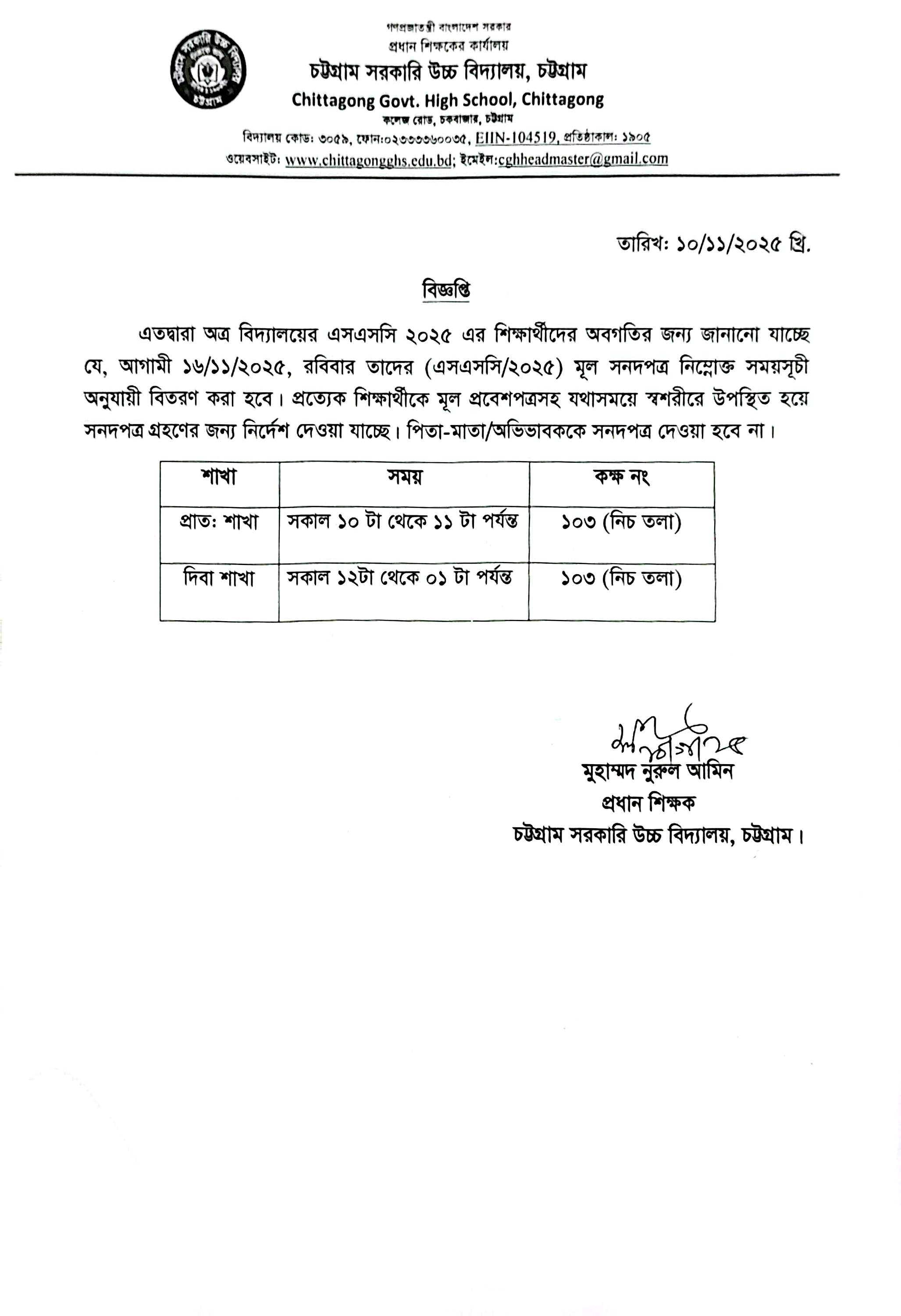 ২০২৫ সালের এসএসসি পরীক্ষার্থীদের মূল সনদপত্র বিতরণ সংক্রান্ত :--